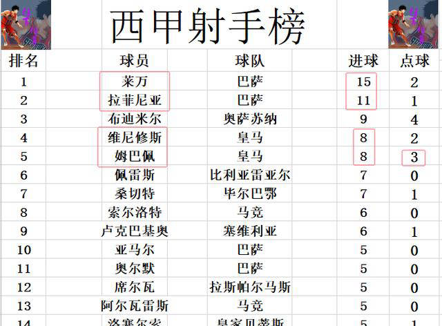 进球榜上,莱万以15球领跑,拉菲尼亚11球位列次席,布迪米尔9球排名第三。姆巴佩与维尼修斯各有8球并列第四,但姆巴佩频频失误令其遭受批评。贝林厄姆则仅差一球即可跻身前十。返回搜狐,查看更多